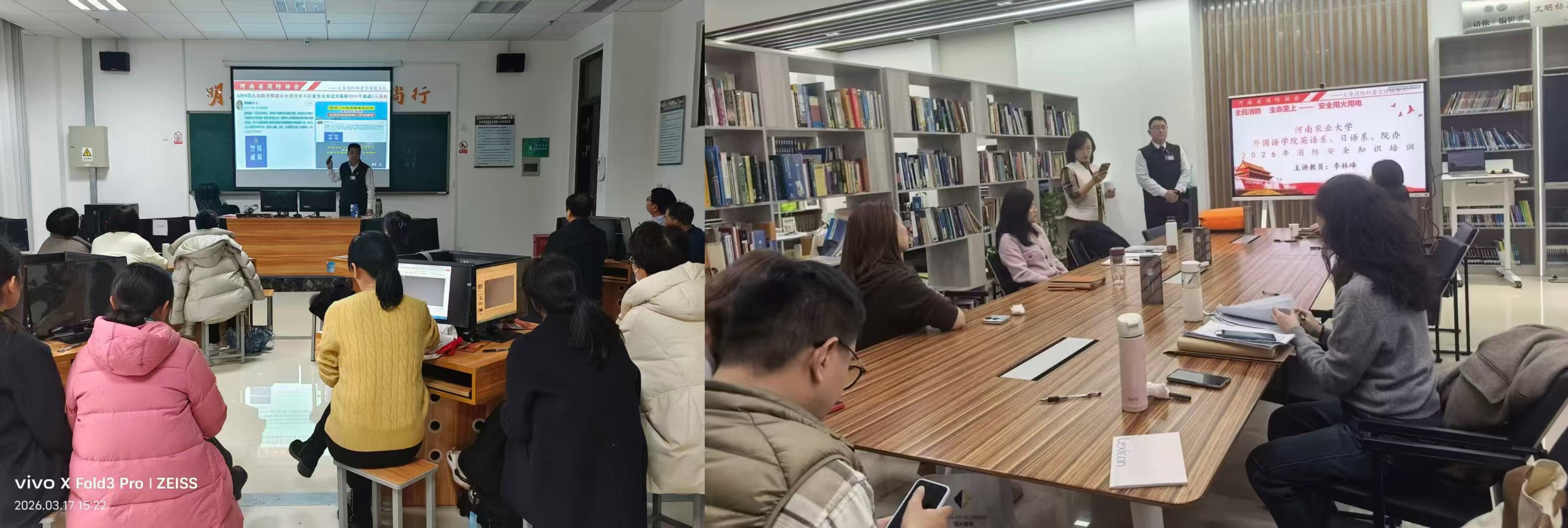 本次培训邀请河南省消防协会义务消防科普宣传服务队王梦阳、王胜强等教员进行专题授课与实操指导。培训紧扣校园消防安全重点,围绕火灾隐患排查、初期火灾扑救、消防器材规范使用、火场疏散逃生技巧等内容展开,采取理论讲解、案例警示、实操演练相结合的方式,确保安全教育入脑入心、技能掌握扎实有效。