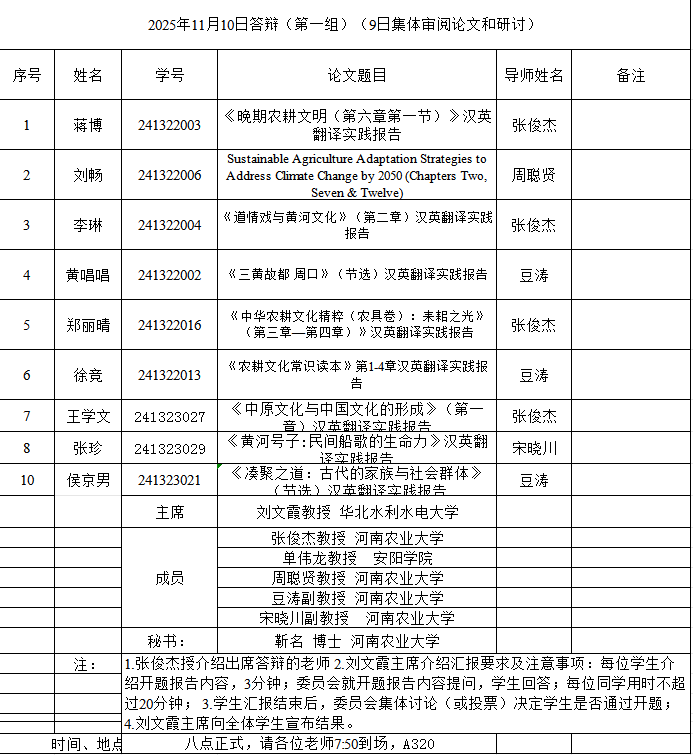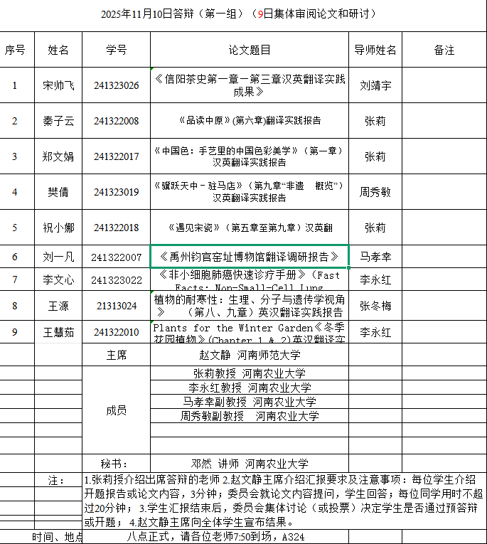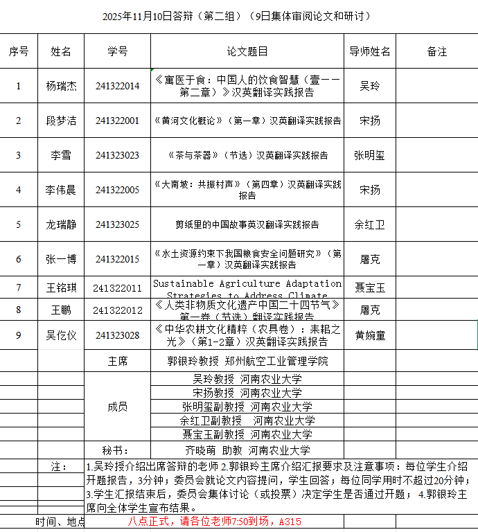 本网讯(审稿:吴玲 ;供稿:马孝幸;摄影:邓然 靳名 齐晓萌 )11月9-10日,永利皇宫app 组织开展了2025年英语笔译专业研究生学位论文开题报告和预答辩暨中期考核论证会。本次论证会特邀河南师范大学赵文静教授、华北水利水电大学刘文霞教授和郑州航空工业管理永利皇宫app 郭银玲教授分别担任论证小组主席,安阳永利皇宫app 院长单伟龙教授和永利皇宫app 硕士生导师担任委员,1名研究生参加预答辩暨中期考核,26名24级研究生参加开题。