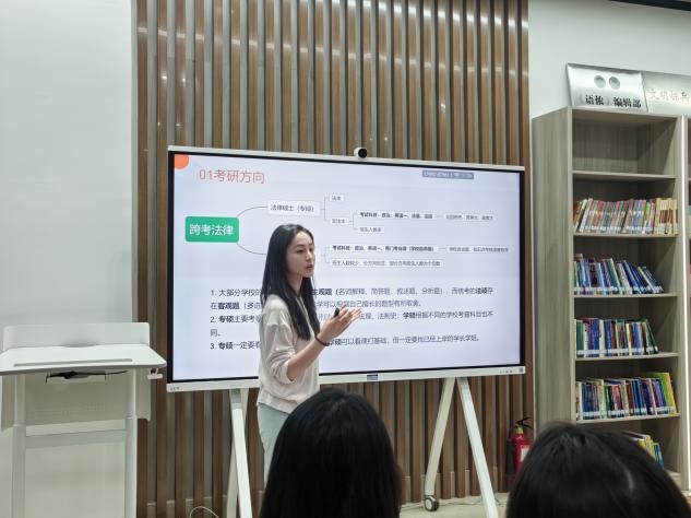 分享会上, 学长学姐用自身经历构建专业成长“导航图”。秦一鸣讲述了自身跨考法学的经历, 展现外院学生如何用语言优势和思辨能力拆解跨学科考研难题;何文竹聚焦考研择校、 专业课准备等方法,为同学们考研规划提供实际参考;赵婷婷则从师范技能提升到教育类备考的角度出发, 讲述“教学实践+理论学习”的备考方案;郑梦琪讲述自己从实习到保研的奋斗历程,激发同学们的学习斗志; 娄栋颖以翻译案例切入,讲述了备考翻译硕士的要点;吕静雯从理论研究角度出发,分享考研学术准备的方法。