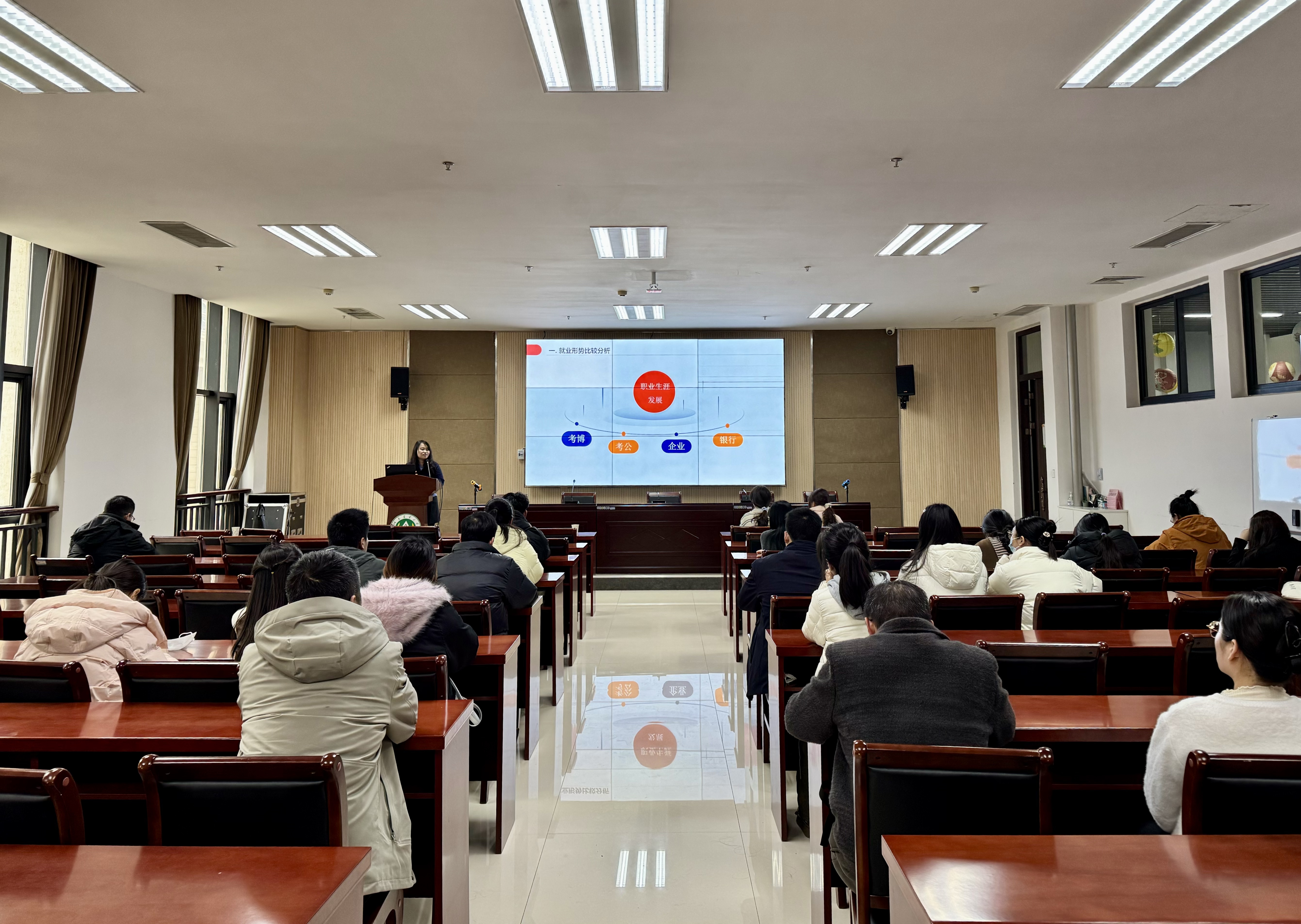 会议伊始,宣讲人首先对当前就业形势进行了深入分析,并详细阐述了高校教师招聘的流程、特点及备考策略,为同学们提供了宝贵的职业规划建议。在互动答疑环节,同学们热情高涨,就高校教师招聘的具体条件、考核内容、面试技巧及职业发展路径等问题与宣讲人进行交流与探讨,现场气氛热烈而有序。