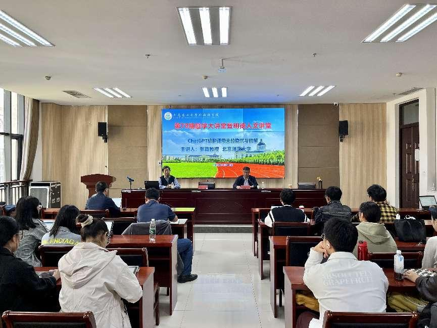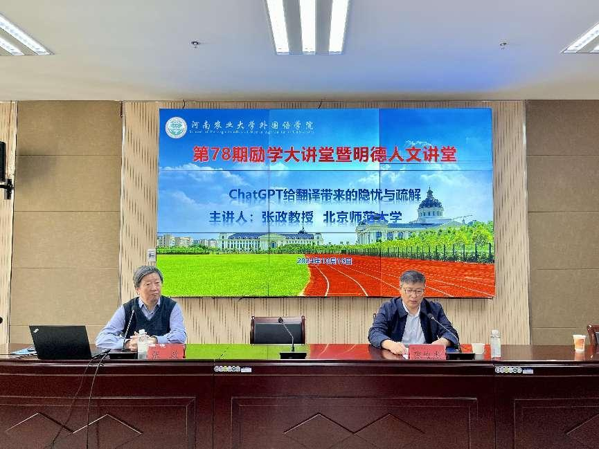 本网讯(审稿:吴 玲;供稿:马孝幸)10月16日上午北京师范大学张政教授、博士生导师应邀做客永利皇宫app 第78期励学大讲堂暨明德人文讲堂,做了题为“ChatGPT给翻译带来的隐忧与疏解”的报告会。报告会由院长张俊杰教授主持,永利皇宫app 师生参加了此次报告会。