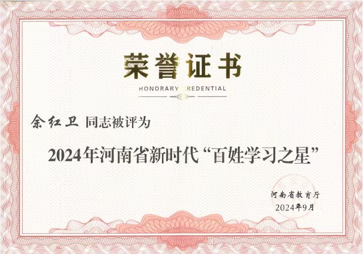 本网讯(通讯员 张德欣)日前,河南省教育厅发布了《河南省教育厅办公室关于公布2024年河南省新时代“百姓学习之星”“终身学习品牌项目”名单的通知》,永利皇宫app 教师余红卫获2024年河南省新时代“百姓学习之星”荣誉称号。