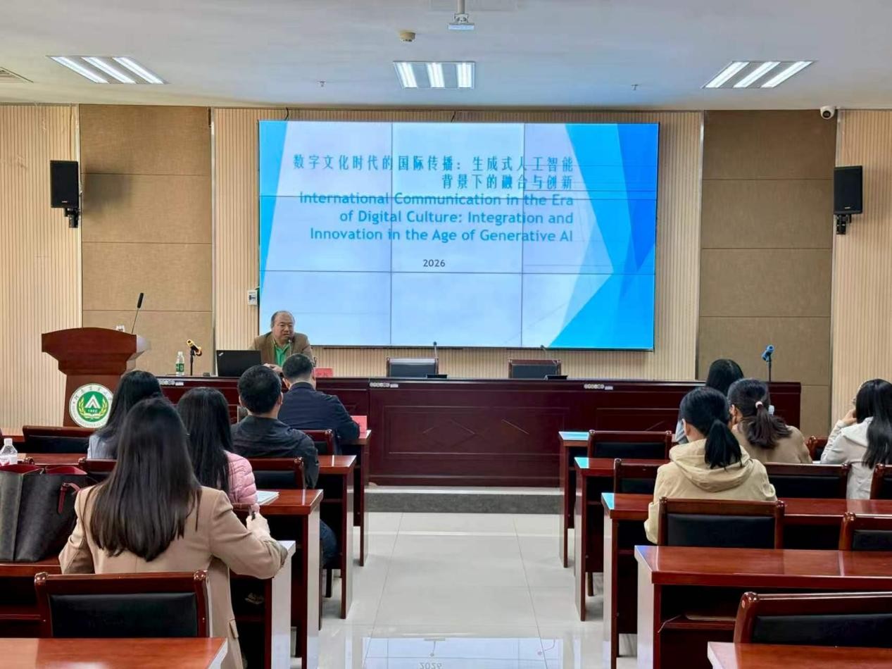 讲座中,杨宏戟围绕生成式人工智能快速发展的时代背景展开深入分享,指出当前文化与数字技术正迎来前所未有的深度融合发展机遇。他通过对“智能”与“创意”两大核心概念的对比剖析,深刻阐释了语言在智能发展与创意生成过程中的核心价值,同时详细解读了计算科学如何搭建语言与创意之间的联结桥梁。结合国内外典型实践案例,杨宏戟聚焦当前文化领域数字化转型的核心发展方向,与在场师生深入探讨了在人工智能赋能背景下,语言文化传播的创意计算实现路径与实践策略,为语言文化数字化转型的创新发展提供了扎实的理论支撑与具有重要价值的实践参考。