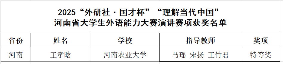 本网讯(审稿:吴玲 供稿:杨爽)近日,2025年“外研社·国才杯”“理解当代中国”大学生外语能力大赛河南省赛圆满落幕。农大学子凭借扎实的专业基础、出色的语言运用能力,共斩获特等奖2项、一等奖3项、二等奖12项、三等奖3项。王孝晗(指导教师:马瑶、宋扬、王竹君)与段佳音(指导教师:张建宇、杨爽、余亮)分获英语演讲赛与日语组比赛特等奖,成功晋级全国总决赛。