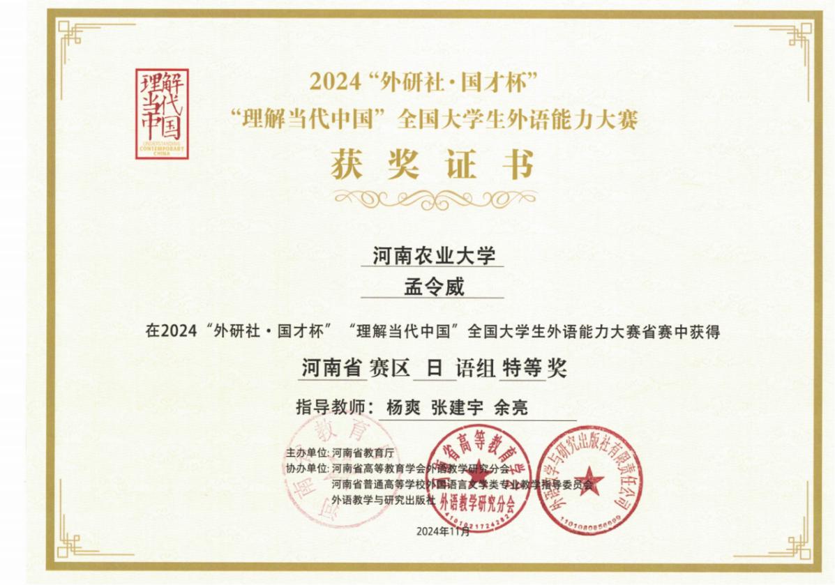 、广东外语外贸大学等知名学府继续深造。参与河南—东盟粮农合作大会、“世界古典学大会·走读中国之中原行”、世界猪肉大会等志愿活动,获得全国大学生乡村振兴大赛金奖、全国翻译大赛一等奖、全国口译大赛二等奖、全国大学生外交英语大赛二等奖、全国高等农林院校大学生英语演讲大赛二等奖、河南省“口译之星”冠军等荣誉。
