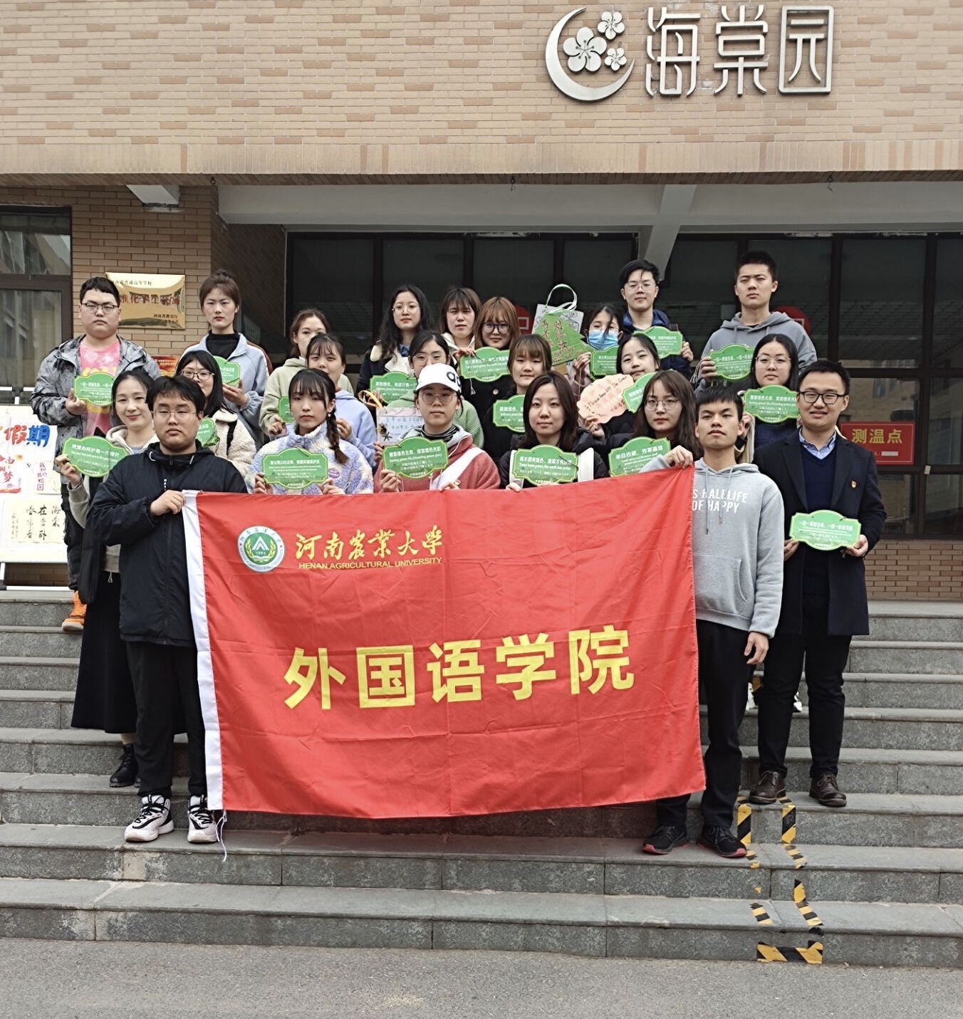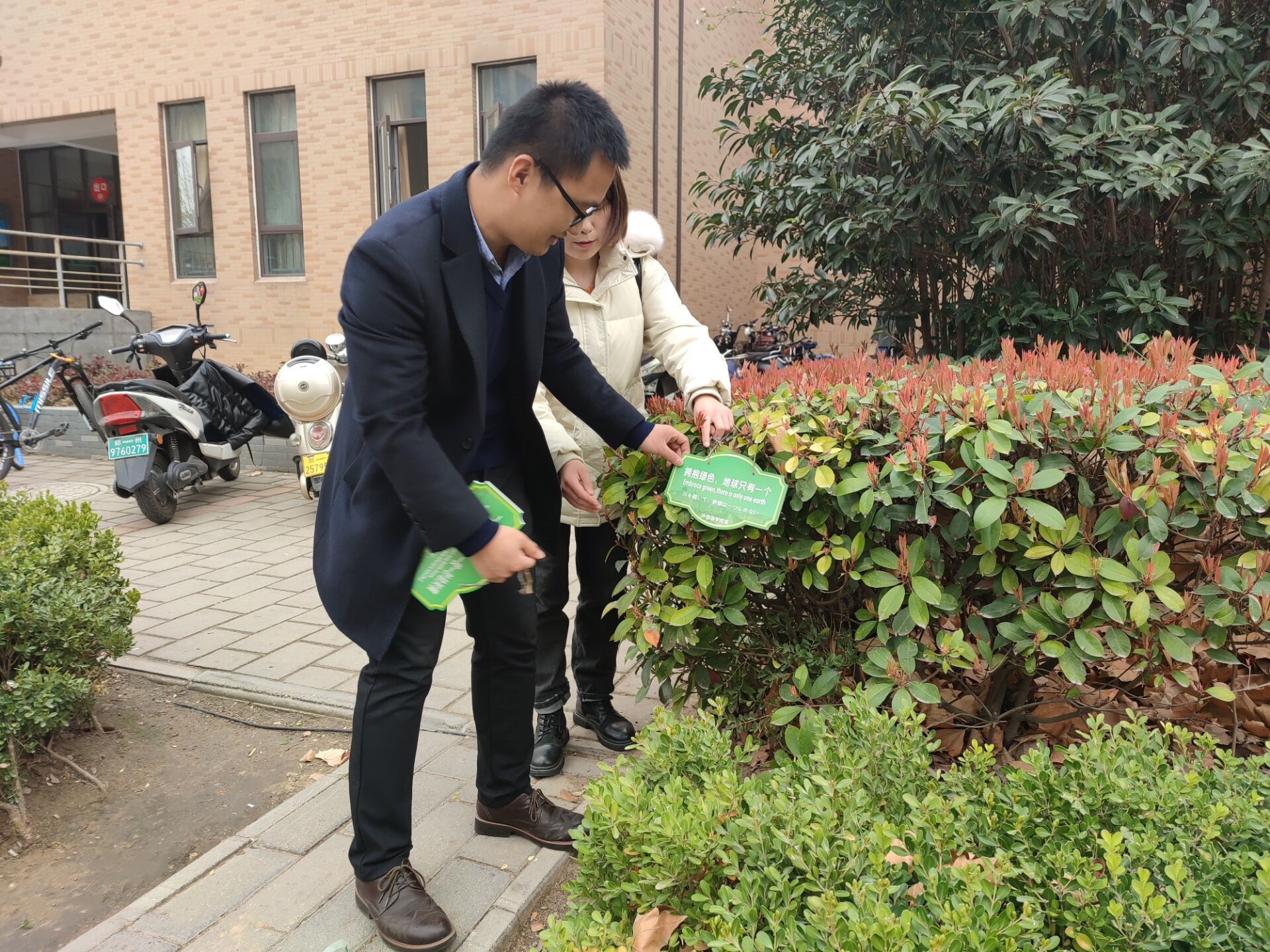 师生一起为校园的树木挂上标语,并科普绿色生活及植树造林的重要性。“举目四顾,芳草遍地”、“Use your love and care to this green space”、“緑色の生命を貯蓄して,緑色の光彩を開放します”等富有永利皇宫app