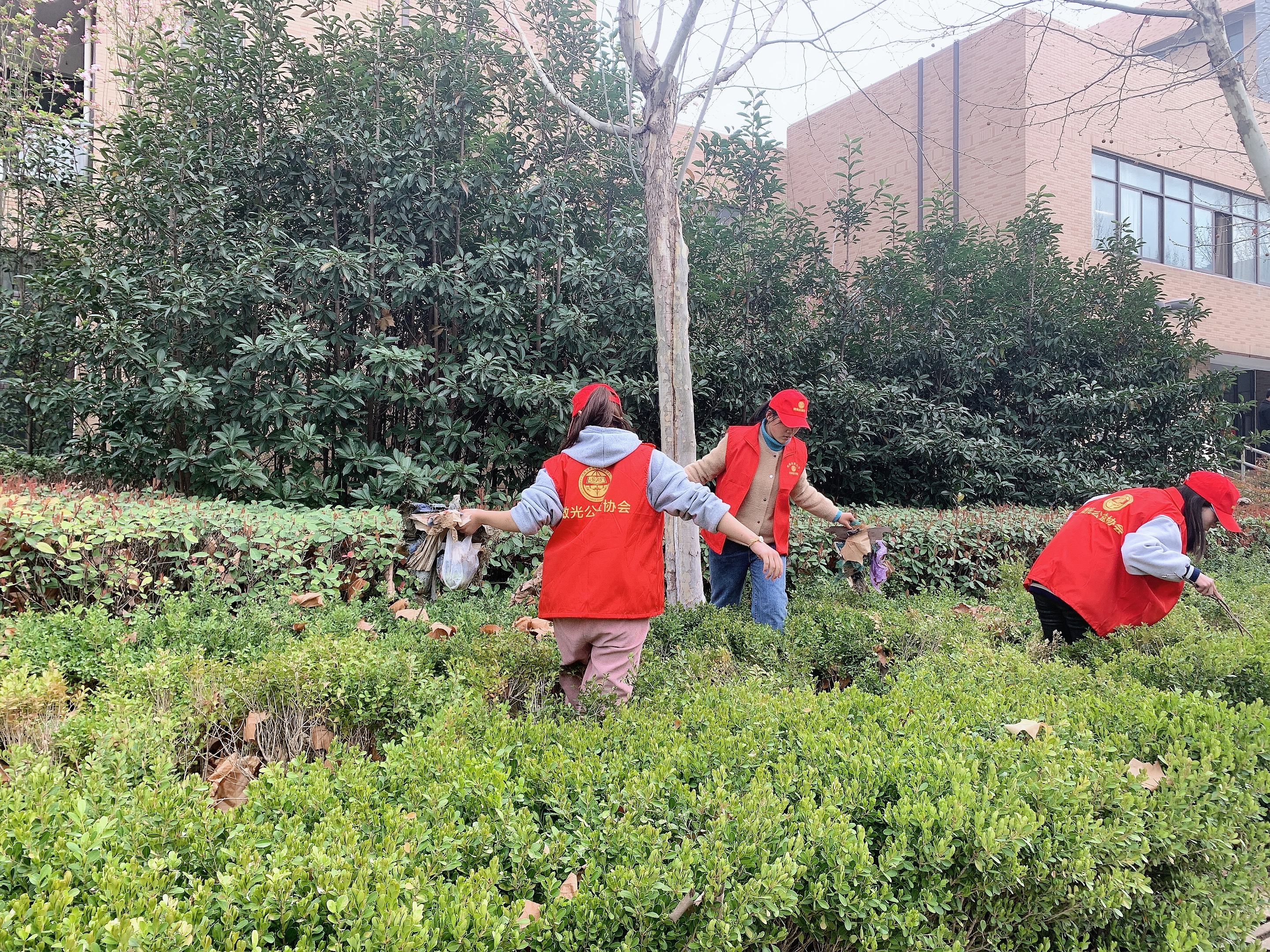 微光公益社团还组织了志愿者们捡拾草丛中的垃圾,用实际行动来努力维护校园的绿色环境。