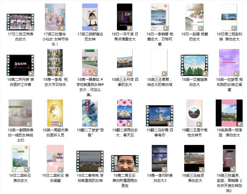 学生兴致勃勃,踊跃参与,带来一场别开生面的文化盛宴。本次活动以“爱荣爱校,学会感恩”为主题,以网络作品为载体,学生热情地向心中的“女神”表白:不管是亲爱的家人、老师,亲密的同学、闺蜜,还是疫情中默默付出的社会工作者,都是同学们魅力无限,可敬可爱的女神。同学们积极创新、各显神通,各类作品风格迥异,让人大开眼界,赞叹不已。无论是一抹抹俏丽身影组成的视频,还是一句句真情流露汇成的文章,都体现了同学们对世界的诚挚感恩,对美好生活的热爱和追求。