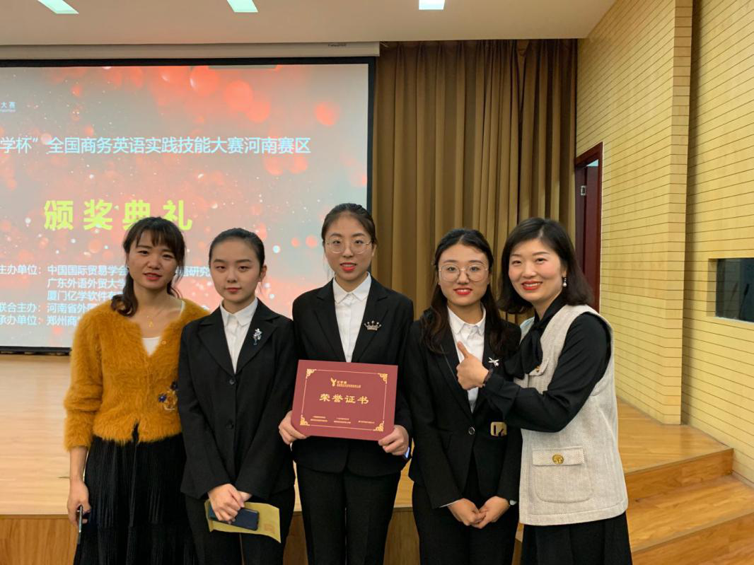 老师老师柴奇、关珊珊的指导下,他们运用扎实的商务英语知识,以精彩的口语表达博得众彩、脱颖而出,经过与来自24所高校的代表队为期两天的激烈角逐,最终喜获三等奖。